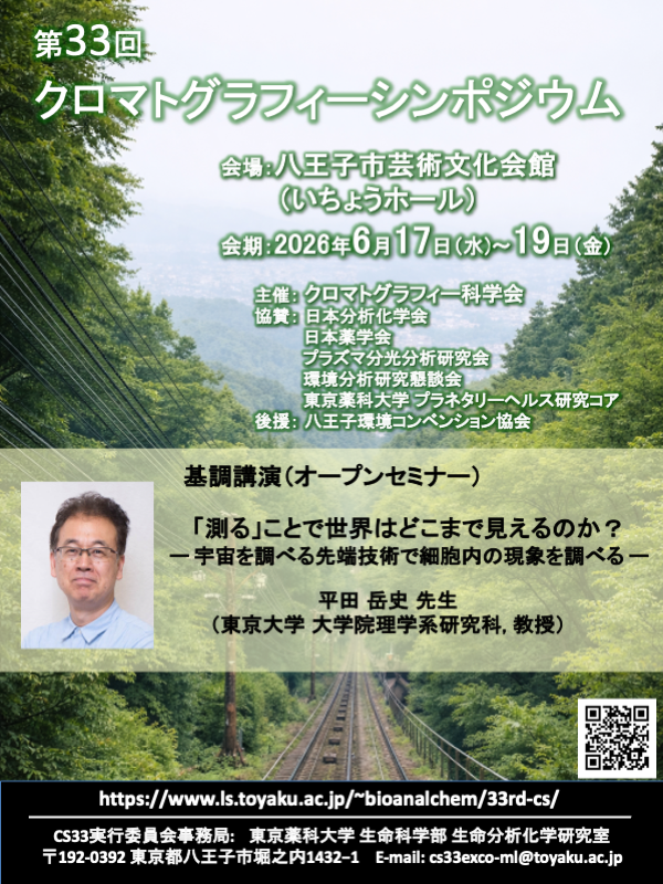 第33回クロマトグラフィーシンポジウム」を2026年6月、東京都八王子市で開催いたします。八王子は歴史と先端技術が融合する学術都市で、多くの大学・研究機関が集まっています。本シンポジウムでは、基礎研究から産業応用まで幅広い分野の講演・ポスター発表を予定しており、次世代のクロマトグラフィー技術について活発な議論が行われます。皆様のご参加を心よりお待ちしております。