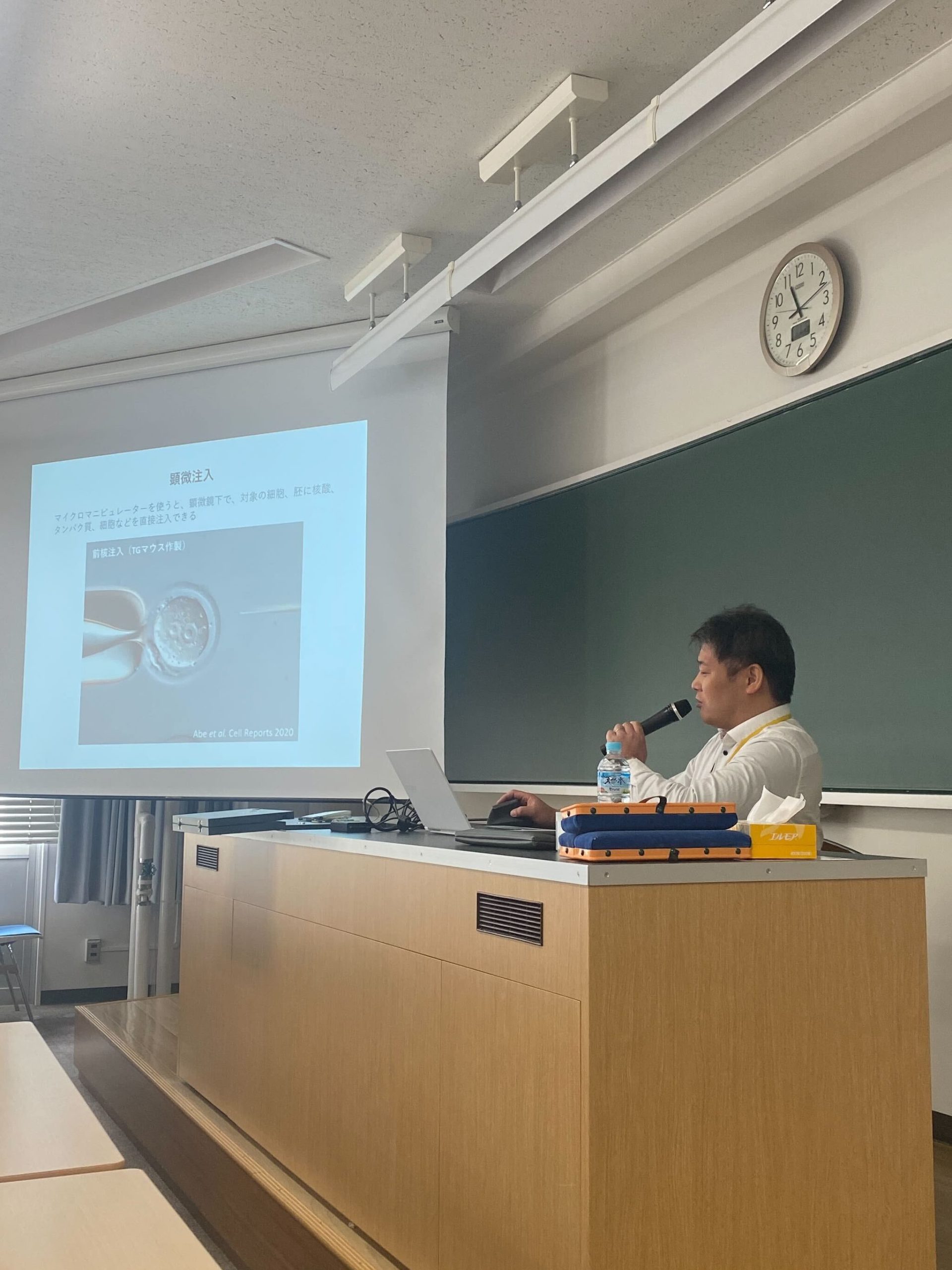 体外受精から胚盤胞補完法まで、まさに発生工学技術の基礎から応用を、これまでの先生のご研究内容を交えながら解説していただきました。実際の操作を撮影していただいた動画が多く、4年生も目から理解できる、とてもわかりやすい授業でした。先生が簡単に「こうすればできます」とおっしゃっていた技術の大半は、常人にはすぐにはできない匠の技です…。ちなみに水谷先生は、助教のマイクロマニピュレーション技術の師匠でもいらっしゃいます🎓✨